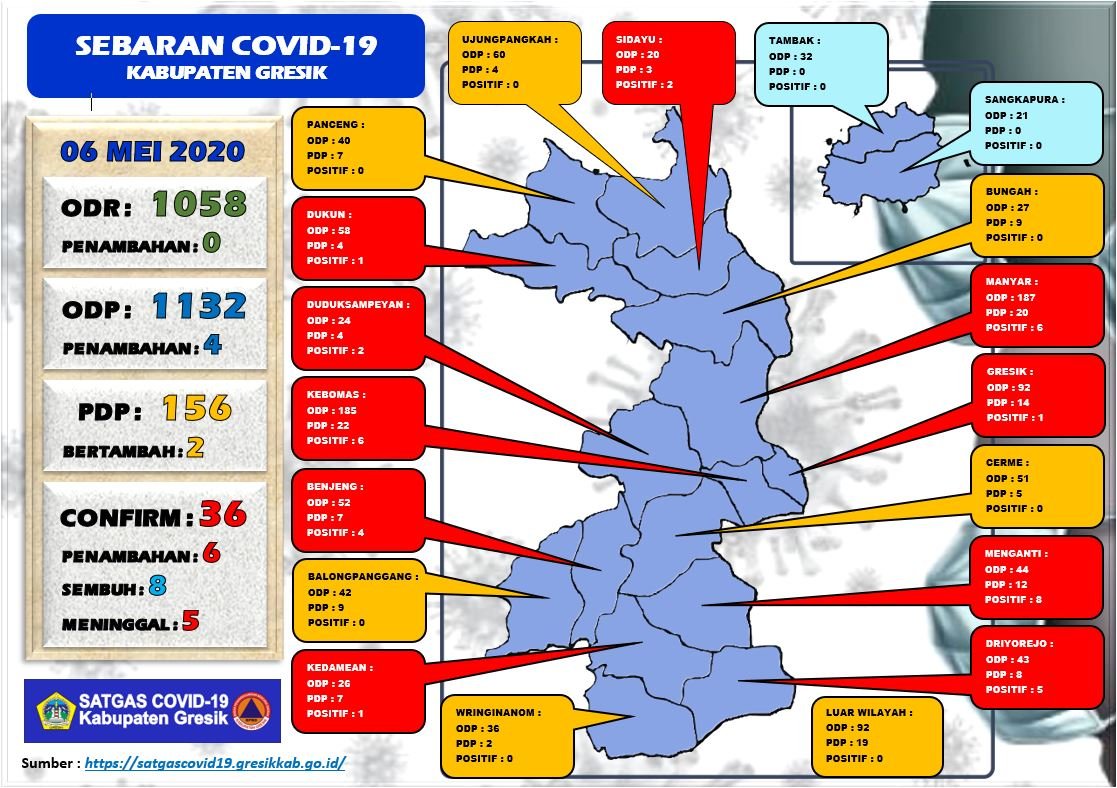 Berdasar laporan Satgas Covid-19 Gresik per Rabu (6/5) petang, telah terjadi lonjakan tajam hingga 6 orang sehingga total kasus positif Covid-19 Gresik kini menjadi 36 orang. Rinciannya 23 orang dirawat, 8 sembuh, dan 5 orang lainnya meninggal dunia.