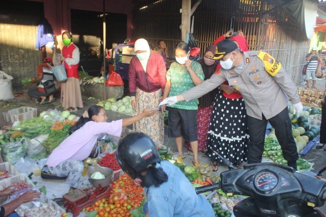 Untuk itu jajaran Polres Blitar Kota blusukan di tengah pasar dipimpin Kapolres Blitar Kota AKBP.Leonard M Sinambela bersama Muspika Kecamatan Ponggok dan beberapa Pejabat Polres Blitar Kota Selasa (13/5) sejak pukul.06.30 WIB.