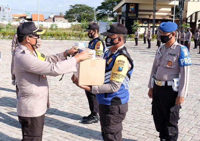 Apel pendistribusian sembako secara simbolis dilakukan Kapolresta Sidoarjo diberikan kepada Bhabinkamtibmas Polsek jajaran, memberikan bantuan sembako 31 masing-masing 5 Kg beras, untuk dibagikan kepada masyarakat Sidoarjo di beberapa titik diwilayahnya masing-masing.