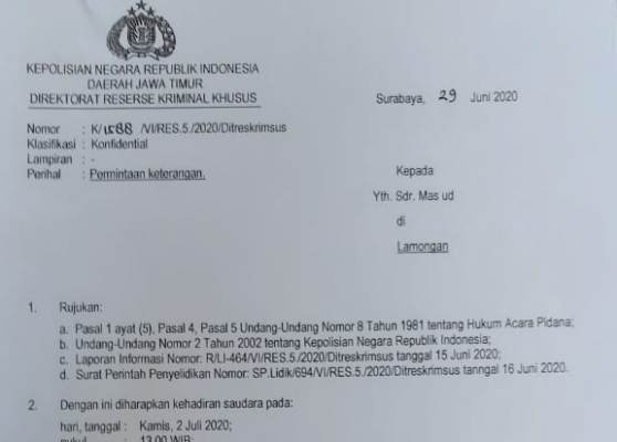 Ipda Wawan Triono selaku penyidik Unit IV Subdit Tipidter Ditreskrimsus Polda Jatim mengatakan, terkait dugaan pelanggaran sudah dijelaskan secara detail dalam surat panggilan.