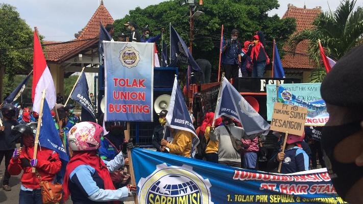 Aksi buruh yang tergabung dalam Sarbumusi ini dipicu kebijakan perusahaan yang melakukan PHK sepihak. Dalam aksinya massa mendatangi Pendopo Kabupaten Sidoarjo.