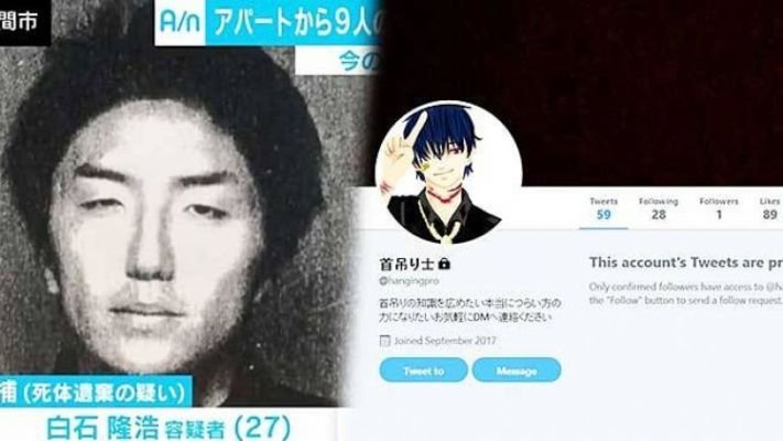 Takahiro Shiraishi, pembunuh berantai, pemilik apartemen, dan tersangka yang pada waktu itu berusia 27 tahun, menggunakan media Twitter untuk menjerat para korbannya. Shiraishi mencari wanita-wanita di Twitter yang memiliki tanda-tanda depresi dan keinginan untuk bunuh diri. Begitu ditemukan, ia akan langsung mengirimkan korbannya pesan yang bertuliskan “ayo mati bersama”.
