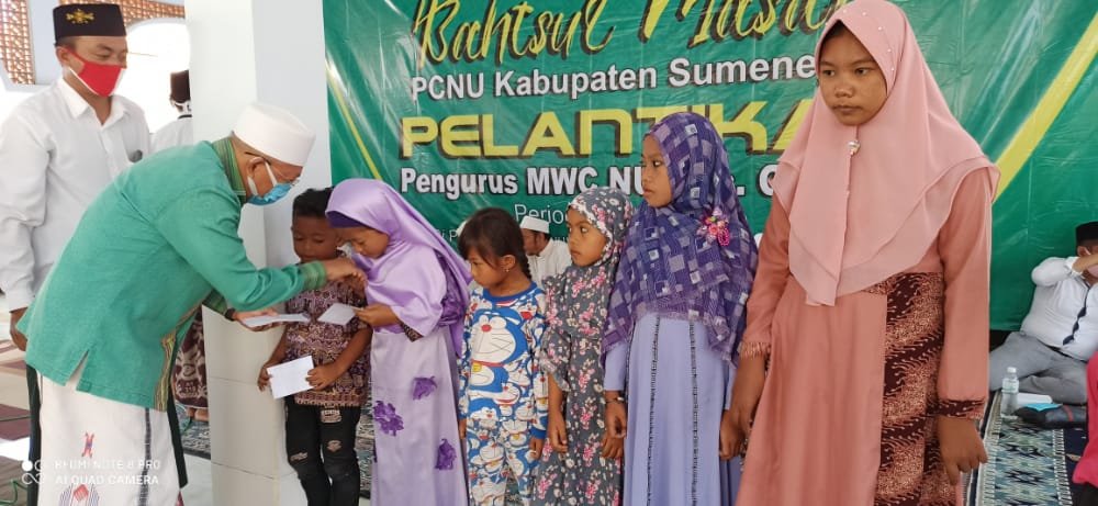 Pada acara tersebut ada penyerahan santunan kepada anak yatim yang secara simbolis diserahkan oleh A’wan PCNU Kabupaten Sumenep KH. A. Busyro Karim yang masih akan menjabat Bupati sampai Februari 2021.