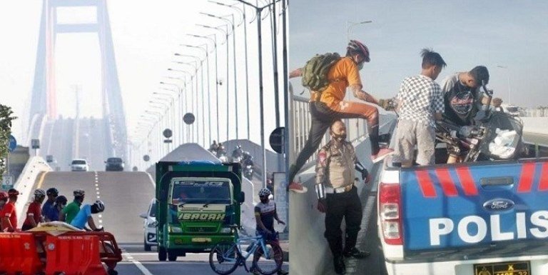 “Jalan tol Jembatan Suramadu tidak diperkenankan untuk R2 (roda dua). Bisa R2 tapi menempati jalur khusus di kanan-kiri. Terus kalau R2 boleh, jadi sepeda angin boleh? Sepeda angin itu sudah lama tidak boleh melintas di sana,” kata Kompol Eko kepada Radio Suara Surabaya, Sabtu (23/1/2021).