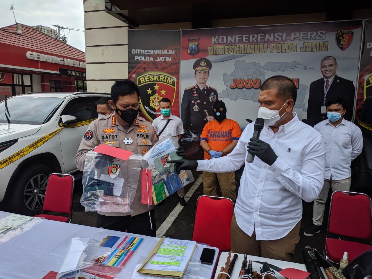 Sementara itu, Dirreskrimum Polda Jatim Kombes Pol Totok Suharyanto menjelaskan bahwa pelaku ini untuk meyakinkan para korbanya, pelaku mengaku sebagai makelar tanah dan memberikan cek dengan nilai 225 miliyar kepada korban.