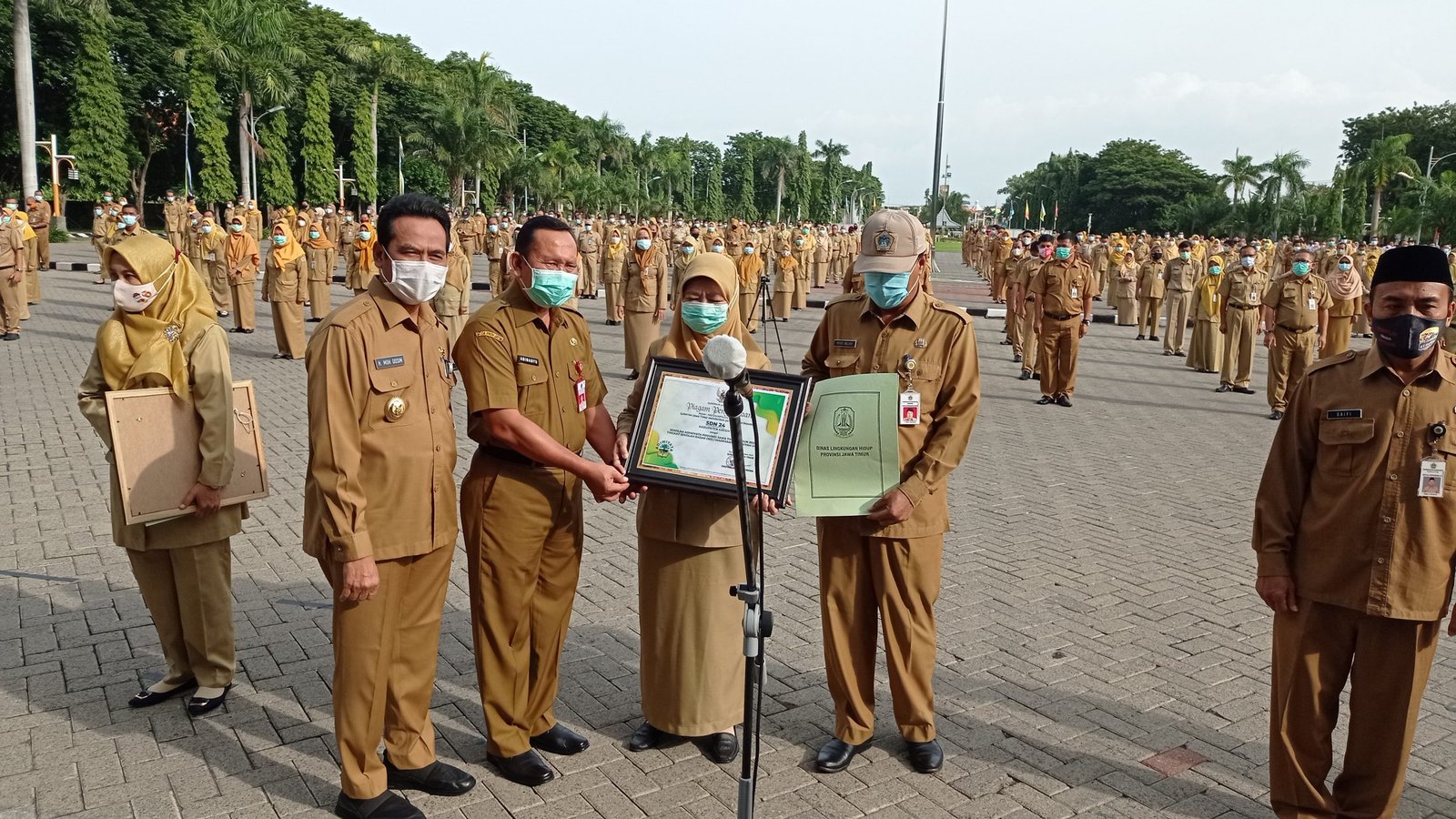 Penyerahan penghargaan dilakukan Plt Bupati Dr. Mohammad Qosim saat apel pagi ASN dan Kepala OPD Pemkab Gresik di Halaman Kantor Bupati Gresik pada Senin (8/2).