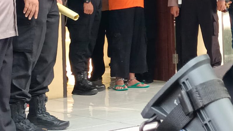 Terlihat dengan pengawalan petugas para tersangka tuntun dengan mata tertutup. Sementara kaki mere dirantai, dan tangan diborgol. Para tersangka teroris yang berjumlah 22 itum, dibawa menuju Jakarta.