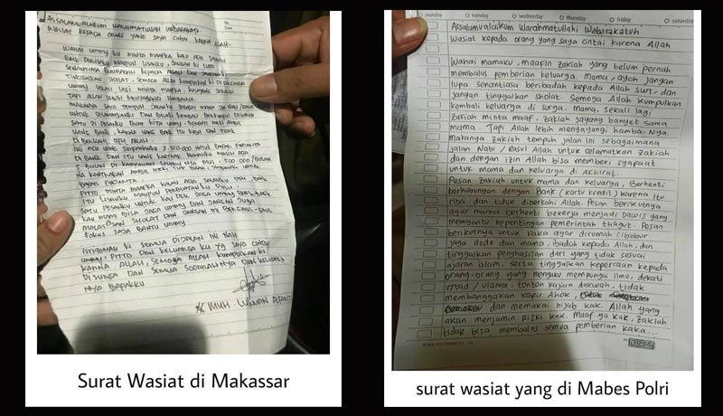 Surabayaonline.co | Beredar luas bukti-bukti berupa tulisan surat wasiat yang di buat pelaku bom bunuh diri di Gereja Katedral Makassar dengan kasus terorisme di Mabes Polri Jakarta.