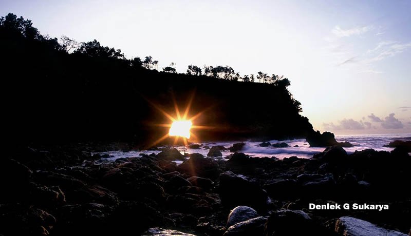 Matapun terus bergerak, Deniek melihat di kejauhan, cahaya mentari berbinar dari sebuah lubang besar di kaki bukit batu di pinggir pantai yang menjadikan panorama ini tampil dramatis.