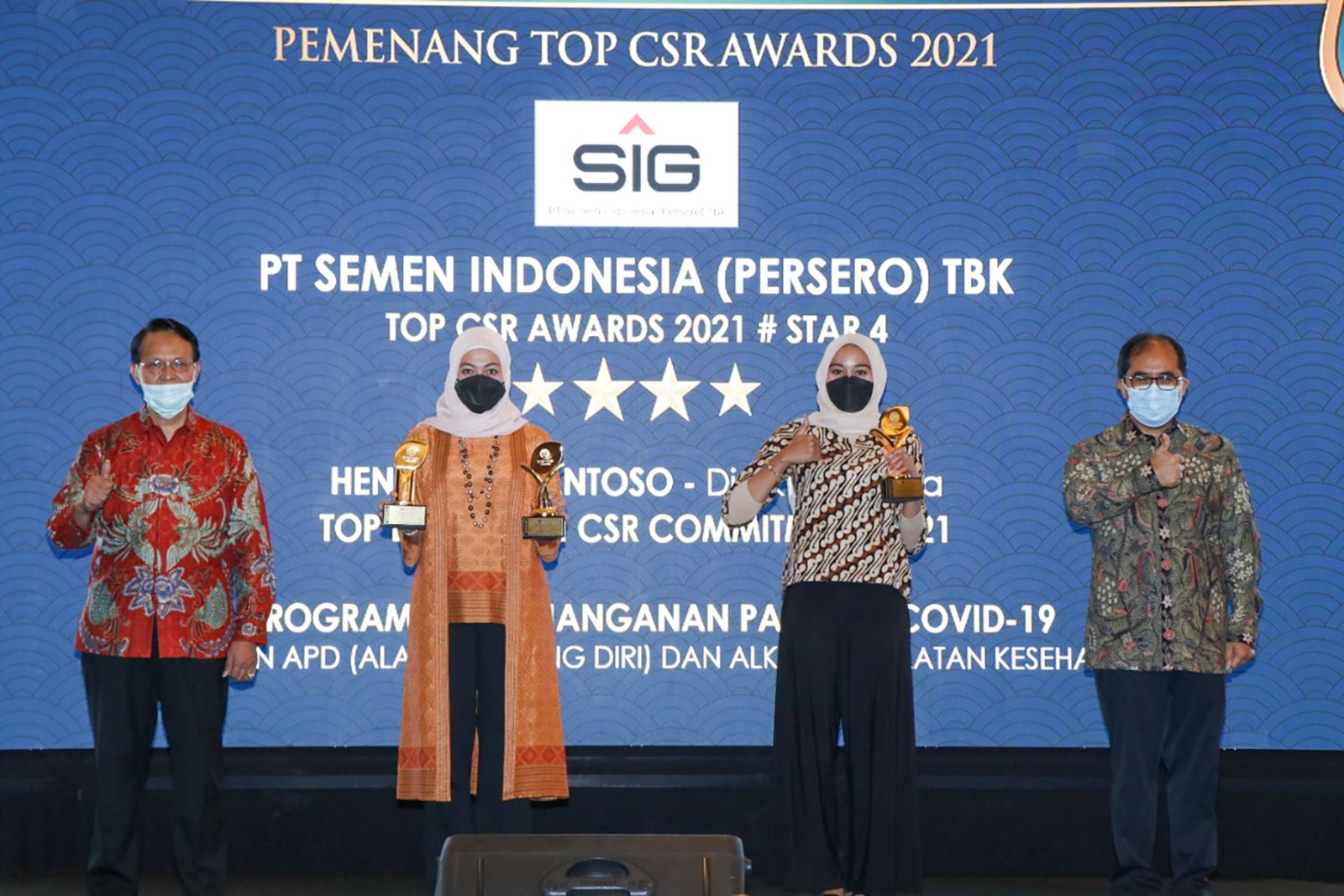 SIG meraih penghargaan kategori TOP CSR Awards 2021 on Star 4, TOP CSR Awards 2021 #Program CSR Penanganan Pandemi Covid 19 dan “Top Leader on CSR Commitment 2021” untuk Direktur Utama SIG, Hendi Prio Santoso.