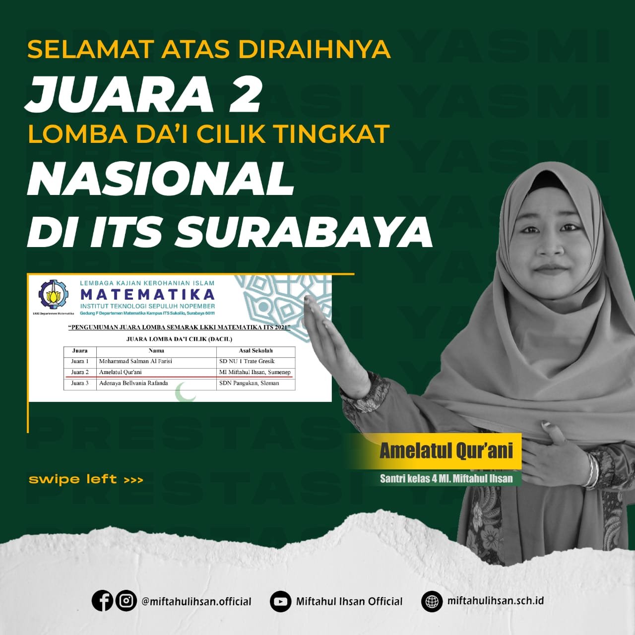 SURABAYAONLINE.CO, Sumenep – Santri Pondok Pesantren Miftahul Ihsan, Errabu, Bluto, Sumenep, kembali menorehkan prestasi di tingkat nasional. Kali ini, santri kelas 4 Madrasah Ibtidaiyah (MI) atas nama Amelatul Qur’ani berhasil meraih juara 2 lomba Da’i Cilik (Dacil) di salah satu kampus terbaik Indonesia, Institut Teknologi Sepuluh Nopember (ITS) Surabaya, Jawa Timur.