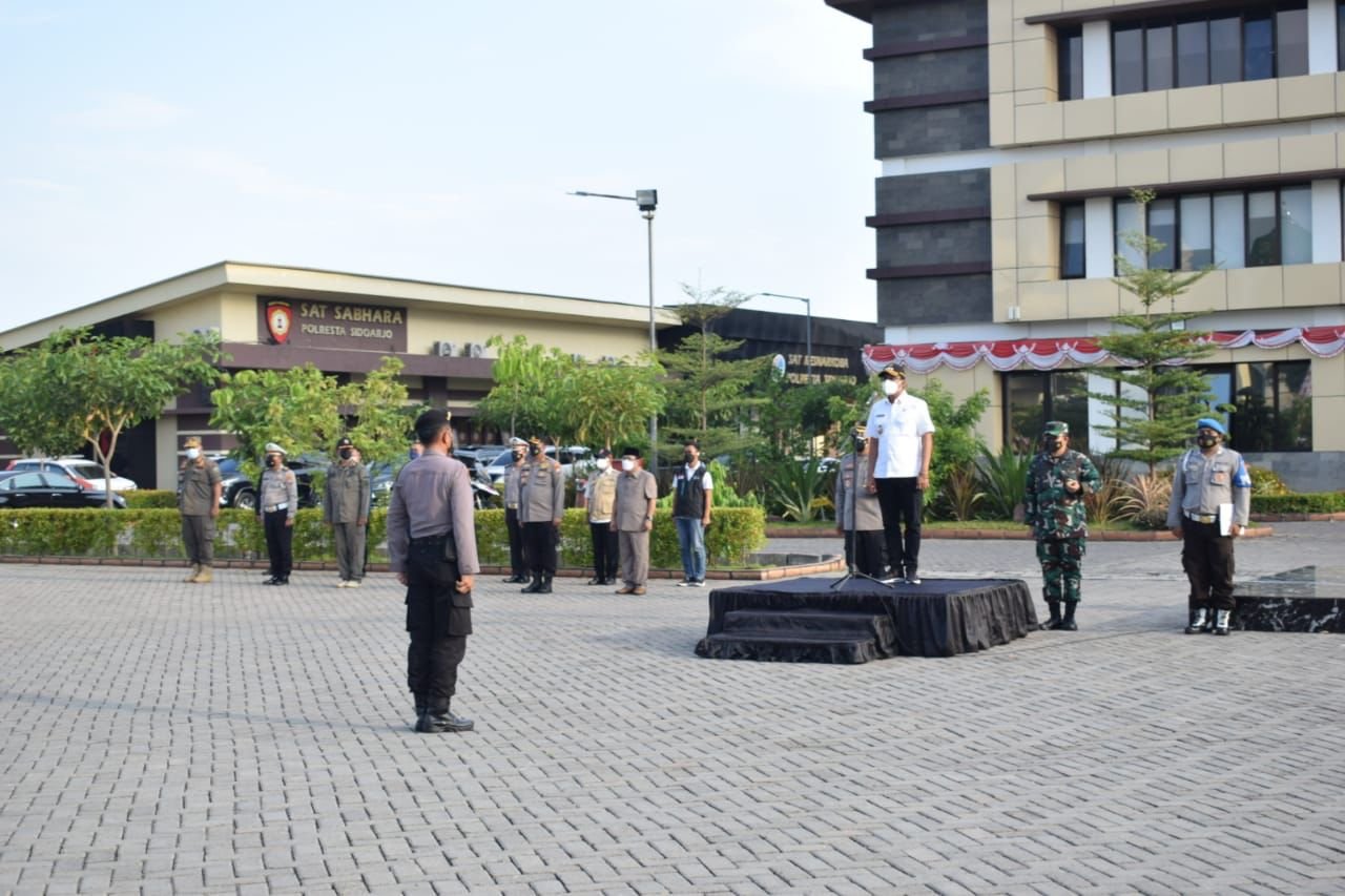 SURABAYAONLINE.CO, Sidoarjo – Forkopimda Sidoarjo melaksanakan apel gelar pasukan, dalam rangka pemindahan warga isolasi mandiri (isoman) ke isolasi terpusat (isoter) yang tersebar di sembilan tempat di wilayah Kabupaten Sidoarjo. Apel gelar pasukan diikuti personel gabungan dari Polri, TNI, Satpol PP, Dinas Kesehatan, Ormas dan komunitas dilaksanakan di Mapolresta Sidoarjo, Rabu (18/8/2021).