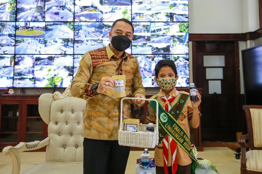 SURABAYAONLINE.CO – uasana berbeda terasa di ruang kerja Wali Kota Surabaya di Balai Kota Surabaya, Jumat (3/9/2021). Kali ini, Wali Kota Surabaya Eri Cahyadi kedatangan tamu spesial, yakni empat finalis Pangeran dan Puteri Lingkungan Hidup 2021 dari SDN Kaliasin 1 Surabaya. Mereka datang dengan membawa berbagai macam produk olahannya masing-masing.