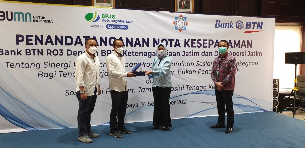SURABAYAONLINE.CO,Surabaya – Hari ini, Kamis, 16 September 2021, telah ditandatangai nota kesepahaman antara Bank BTN Kantor Wilayah III, BPJS Ketenagakerjaan Wil. Jatim, dan DPD APERSI (Asosiasi Pengembang Perumahan dan Pemukiman Seluruh Indonesia) Jatim. Nota kesepahaman ini terkait sinergi penyelenggaraan Program Jaminan Sosial Ketenagakerjaan bagi Tenaga Kerja Penerima Upah dan Bukan Penerima Upah.