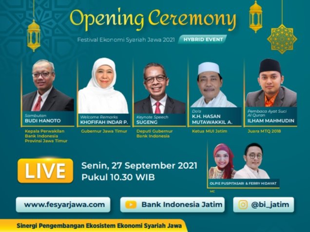 SURABAYAONLINE.CO – Bank Indonesia (BI) Wilayah Jawa Timur terus berkomitmen dalam mendukung perkembangan ekonomi dan keuangan syariah di Indonesia khususnya di wilayah Jawa, melalui gelaran Festival Ekonomi Syariah (FESyar) Regional Jawa 2021. Dengan mengusung tema “Sinergi Membangun Ekonomi Syariah Melalui Digitalisasi untuk Pemulihan Ekonomi”, Fesyar Regional Jawa diselenggarakan secara hybrid pada 27 September hingga sampai – 2 Oktober 2021.