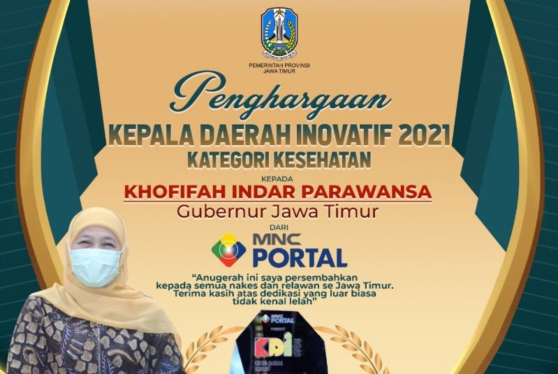 SURABAYAONLINE.CO – Gubernur Jawa Timur Khofifah Indar Parawansa meraih penghargaan sebagai Kepala Daerah Inovatif (KDI) 2021 Kategori Kesehatan dari MNC PORTAL yang disekenggarakan di MNC Conference Hall iNews Tower, Jumat (5/11/21).