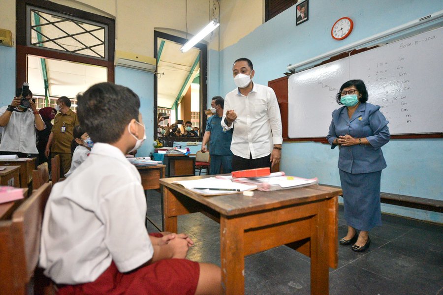 Pada pelaksanaan PTM 100 persen, Wali Kota Surabaya Eri Cahyadi bersama Pimpinan DPRD dan Kepala Dinas Pendidikan Surabaya tampak berkeliling dan mengunjungi sejumlah sekolah.