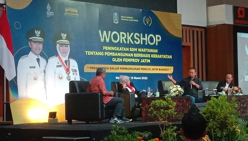 SURABAYAONLINE.CO | MALANG – Dinas Komunikasi dan Informatika (Diskominfo) Provinsi Jawa Timur (Jatim) menggelar workshop peningkatan SDM wartawan tentang pembangunan ekonomi berbasis kerakyatan di Hotel Aria Gajayana Kota Malang, Jawa Timur, Jum’at (11/3/2022).