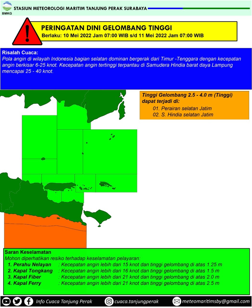 BMKG maritim Surabaya melalui grup info publik BMKG mengimbau agar masyarakat yang beraktivitas di perairan agar waspada terhadap tinggi gelombang lebih dari 2.5 m yang berpotensi terjadi di Perairan selatan Jatim dan Samudra Hindia selatan Jatim.