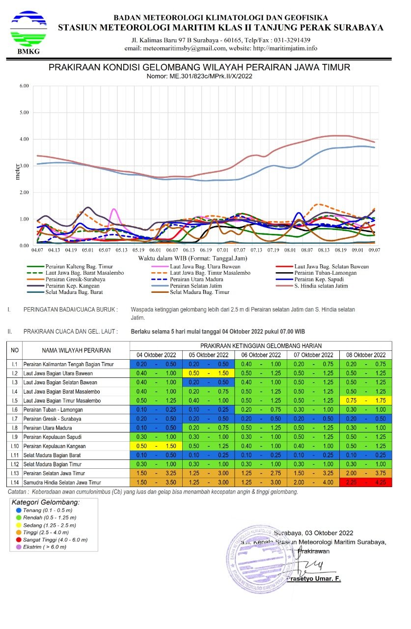 Kepala Stasiun BMKG Maritim Surabaya, Prasetya Umar, dalam rilisnya di grup info BMG Jatim, Senin (3/10/2022) menyampaikan, berdasarkan perkiraan BMKG Maritim Perak, ketinggian gelombang laut di Selat Madura berkisar antara 0.2-0.8 m. Kemudian Laut Jawa bagian timur antara 0.3-1.3 m dan Samudra Hindia Selatan Jatim antara 1.5-3.5 m.