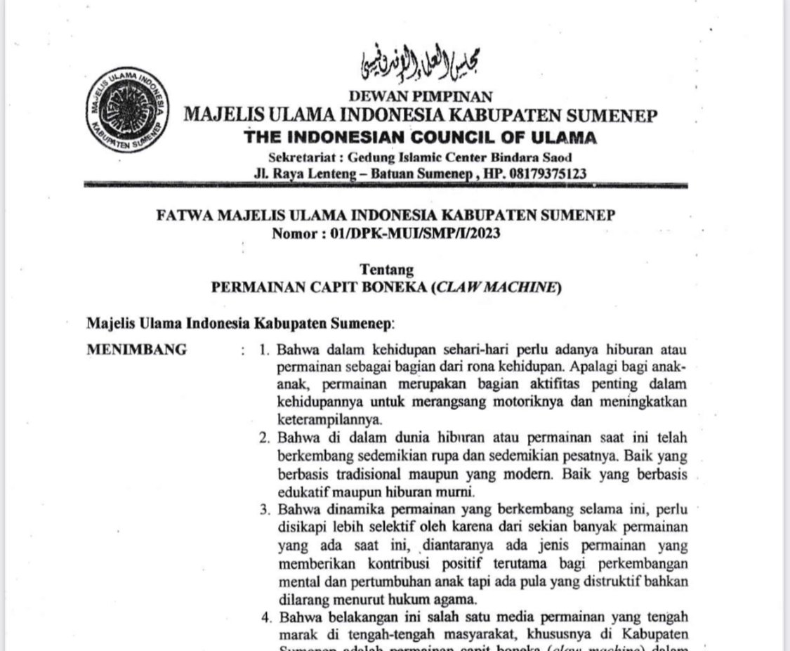 SURABAYAONLINE.CO, Sumenep – Majelis Ulama Indonesia (MUI) Kabupaten Sumenep, Madura, Jawa Timur mengeluarkan fatwa larangan permainan capit boneka (claw machine).