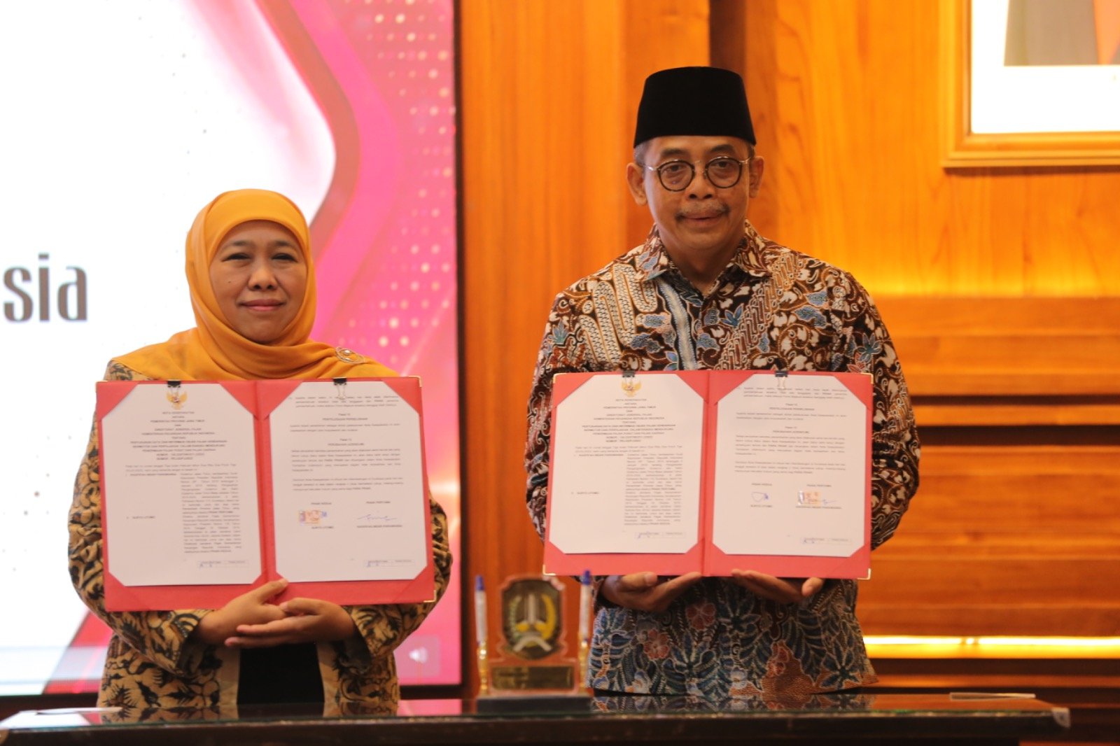 Naskah nota kesepakatan ditandatangani oleh Diretur Jenderal Pajak Suryo Utomo dan Gubernur Jawa Timur, Khofifah Indar Parawansa di Gedung Negara Grahadi, Surabaya, Jumat (3/2).