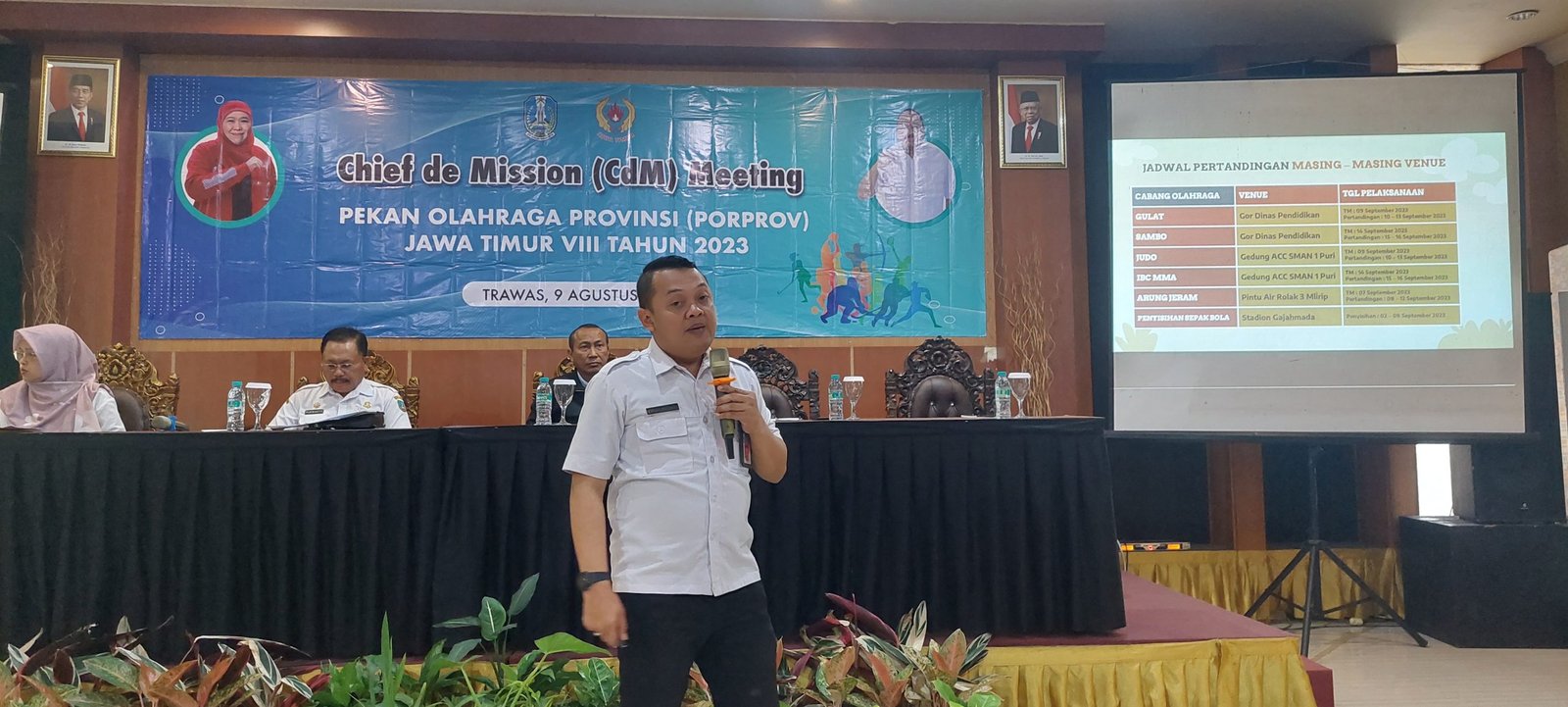 “Tepat satu bulan sebelum Porprov VIII/2023 dibuka pada 9 September nanti, hari ini kita menggelar CdM Meeting untuk mendengar dan melihat paparan tuan rumah, Kabupaten Mojokerto, Kota Mojokerto, Kabupaten Jombang, dan Kabupaten Sidoarjo,” jelas Ketua Umum KONI Jatim, Muhammad Nabil.