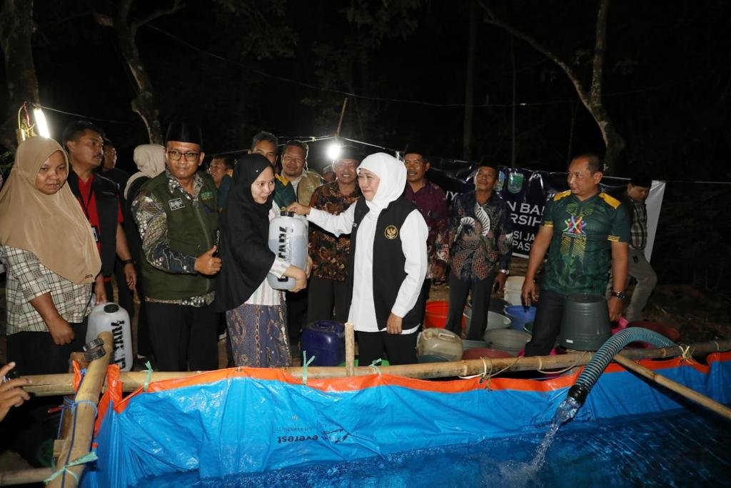 SURON.CO, Pasuruan – Gubernur Jawa Timur Khofifah Indar Parawansa membagikan bantuan air minum kepada warga terdampak kekeringan di desa Pasrepan, Kec. Pasrepan, Kab. Pasuruan pada Sabtu malam (2/9).