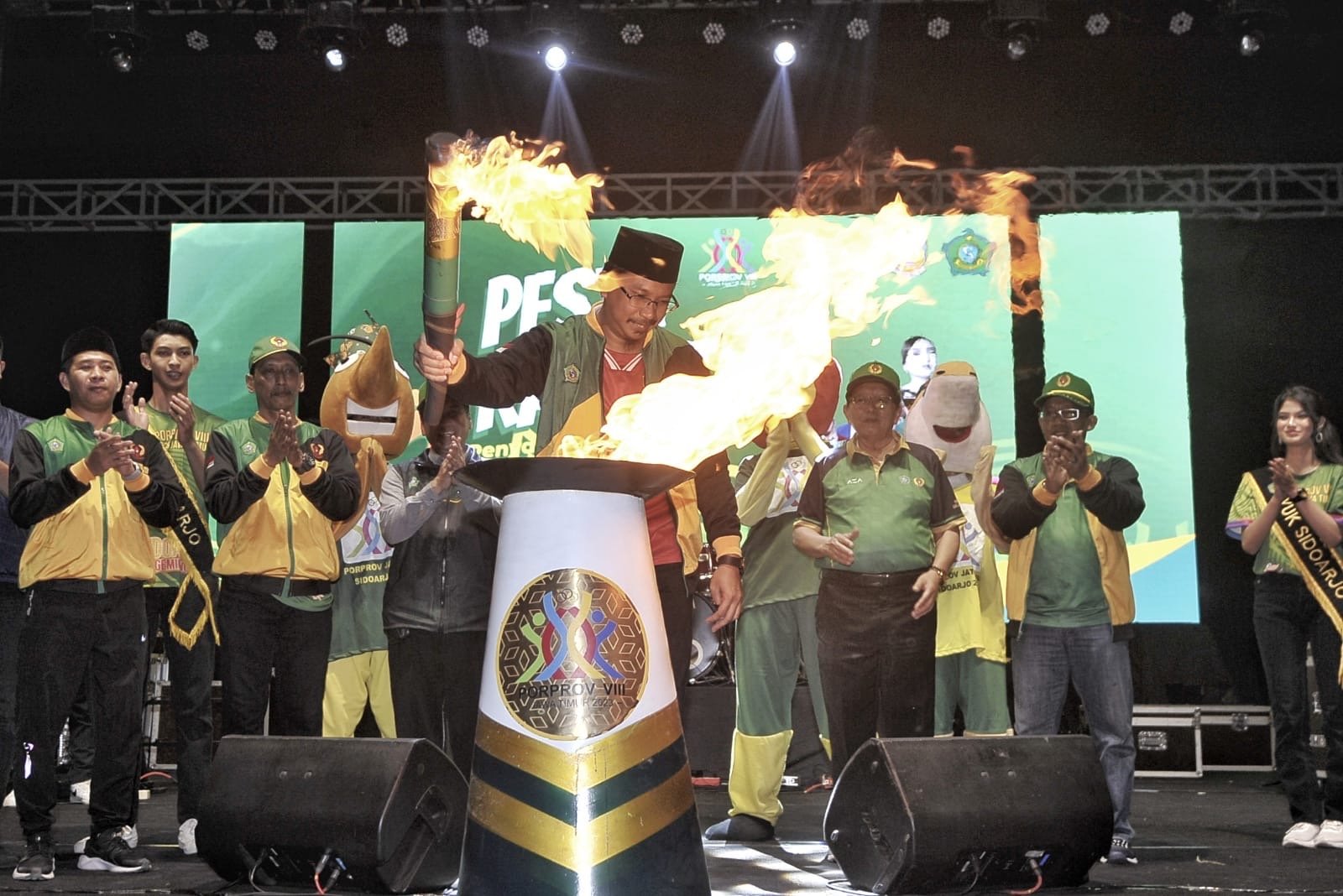 SURON.CO, Sidoarjo– Estafet obor api Pekan Olahraga Provinsi (Porprov) VIII/2023 Jawa Timur (Jatim), finish di Alun – Alun Sidoarjo, Jumat (8/9/2023) malam.