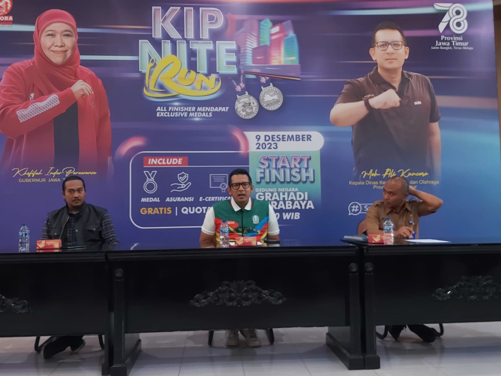 Seperti diketahui, KIP Nite Run 78, sesuai HUT Pemerintah Provinsi Jatim ke 78, jarak yang ditempuh sepanjang 7.8 Km dan pesertanya target 7.800 perserta. “Kalau pesertanya melebih target, kami juga akan menyediakan medali cadangan,” ujar Ali Kuncoro.
