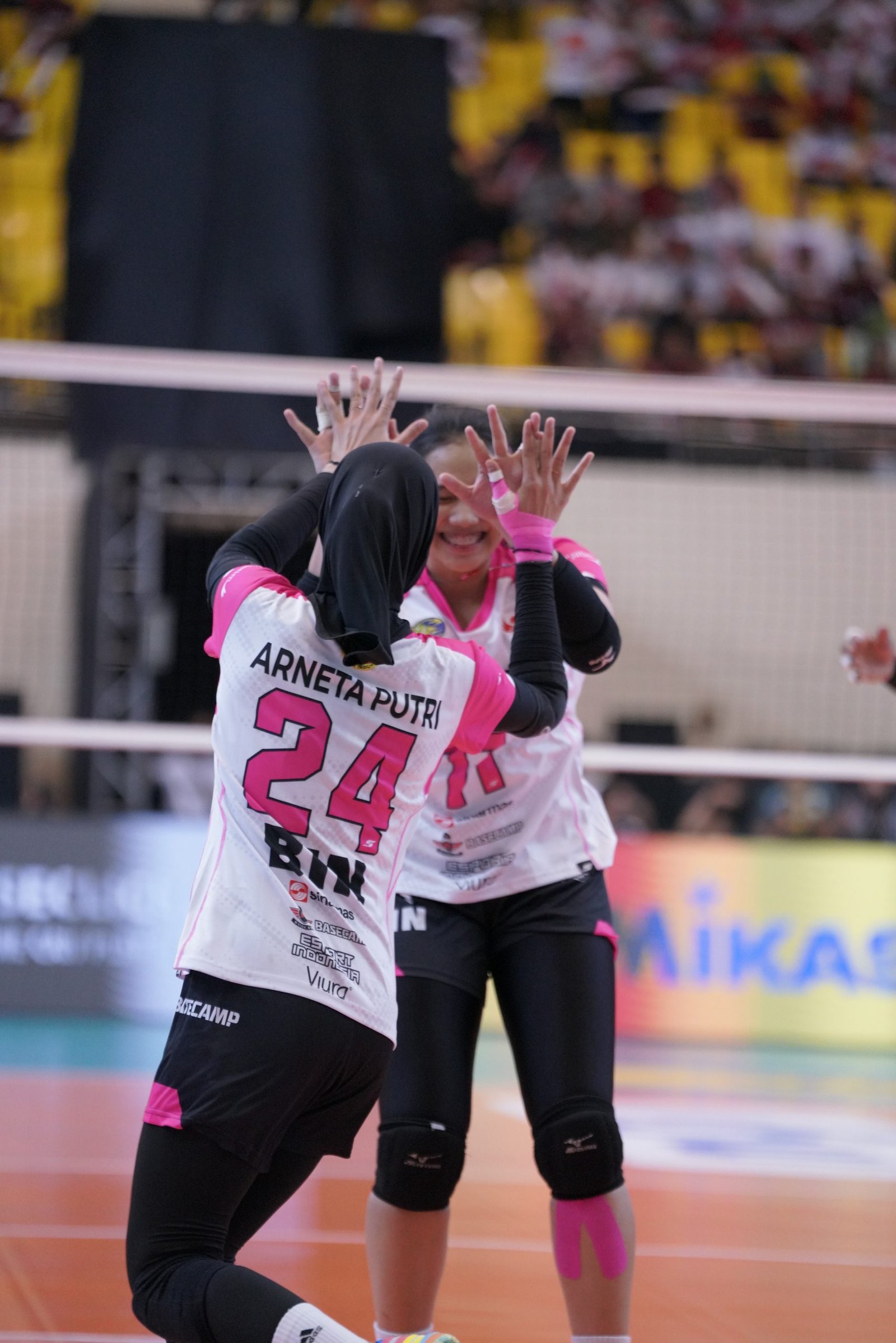 Set kedua Jakarta BIN terus pegang kendali. Monster blok Megawati Hangestri dkk. sangat jitu untuk menghalau spike-spike keras dari Hanny Budiarti dkk.