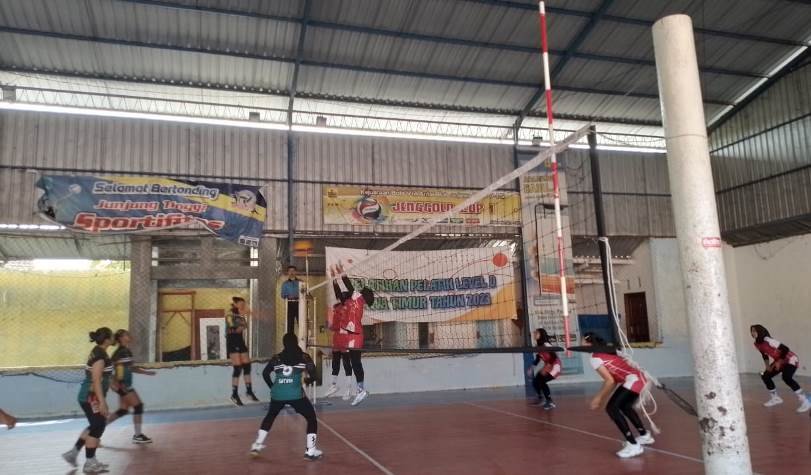 Tampak juga Alito Sportwear, penjual bakso, dan tim sponsor air minum Cheers. Semangat pejuang kemerdekaan diharapkan jadi teladan bagi para atlet muda voli.