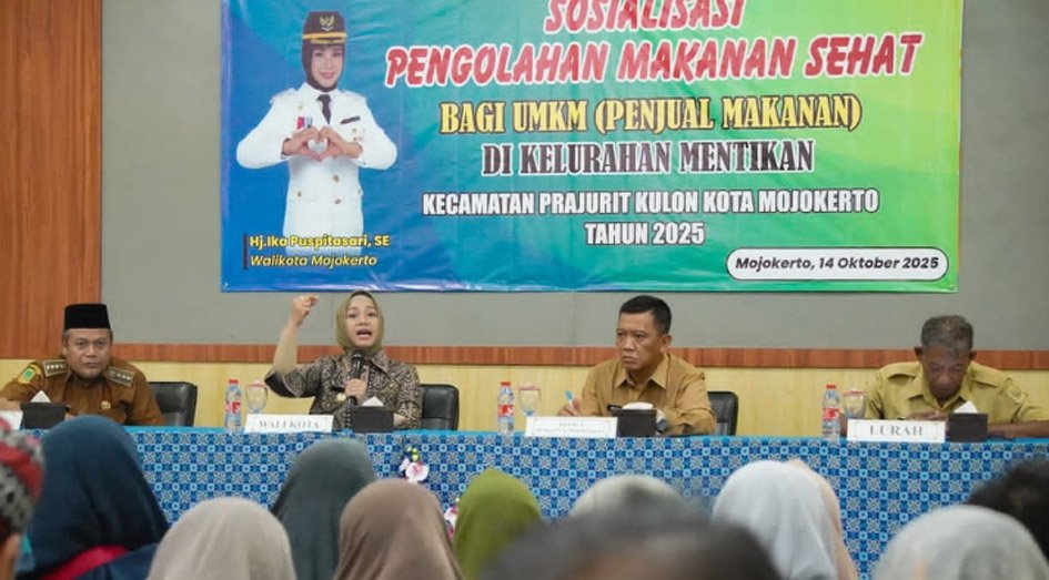 Minke.id – Wali Kota Mojokerto, Ika Puspitasari, membuka kegiatan Sosialisasi Pengolahan Makanan Sehat bagi pelaku UMKM sektor makanan dan minuman (Mamin) di Kelurahan Mentikan, Selasa (14/10/2025).